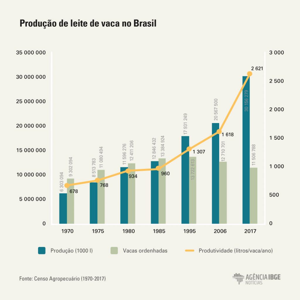 A pecuária de leite está presente em 98% dos municípios brasileiros. A Empresa Brasileira de Pesquisa Agropecuária (Embrapa) estima que, no Brasil, existam aproximadamente 961 mil produtores de leite. Nos últimos 11 anos, a produtividade brasileira cresceu 62% e a produção chegou a 30 bilhões de litros, segundo o IBGE.