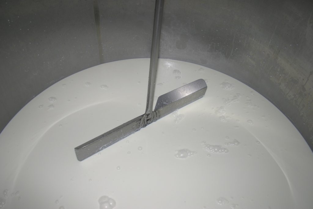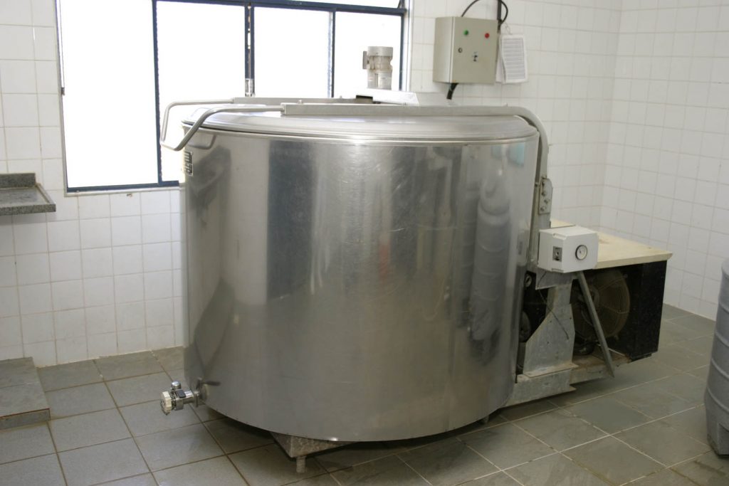 1º – Depois de ordenhado (com ordenhadeira mecânica), o leite é bombeado por meio de dutos até o tanque. Lá, o produto é refrigerado a cerca de 4° Celsius.
