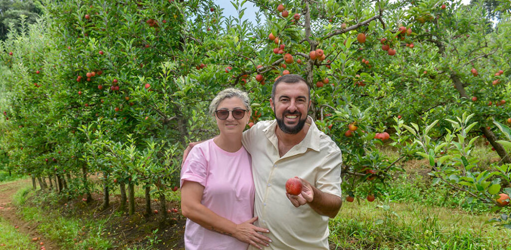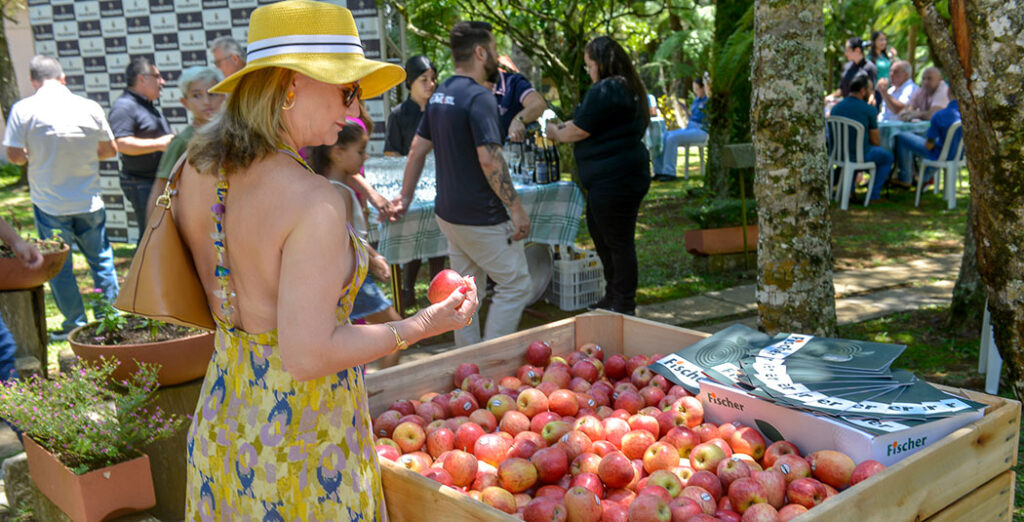 Após o almoço, o grupo de jornalistas tive uma oportunidade única. Guiados por agricultores locais, eles desfrutaram de uma experiência autêntica ao colher maçãs diretamente dos pomares da região. Esta atividade proporcionou aos jornalistas uma conexão íntima com o processo de cultivo e colheita da fruta, permitindo-lhes apreciar de perto o trabalho árduo e a dedicação dos agricultores que tornam Fraiburgo uma das maiores produtoras de maçã do país. A vivência nos pomares não apenas enriqueceu o conhecimento dos jornalistas sobre a produção de maçãs, mas também os imergiu na essência e na tradição da comunidade agrícola de Fraiburgo.
