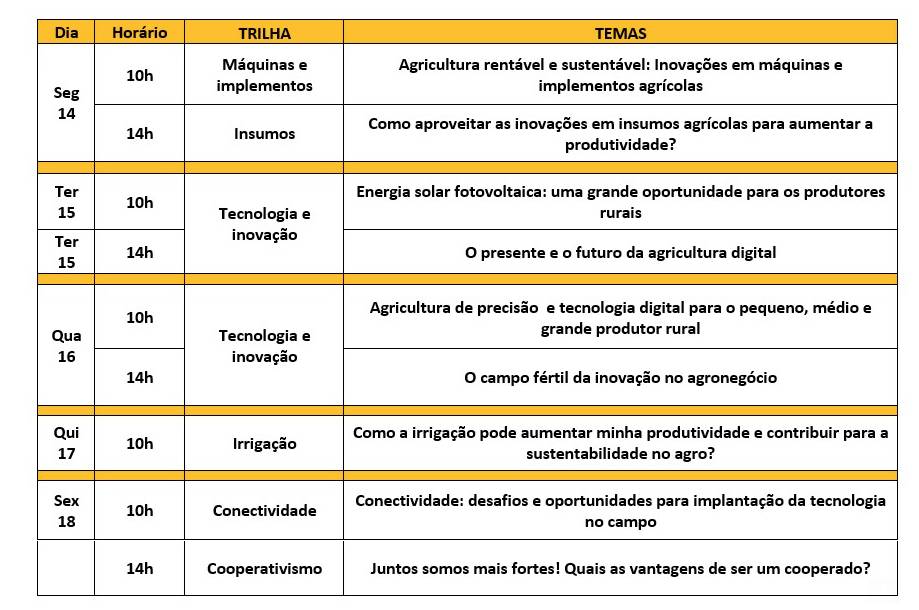 Até o dia 18 de setembro, produtores rurais de todo o Brasil e profissionais do agronegócio poderão, em um mesmo ambiente, acompanhar os eventos de conteúdo, encontrar soluções para seu dia a dia no campo, trocar experiência com outros participantes, e até mesmo iniciar negociações na plataforma.
