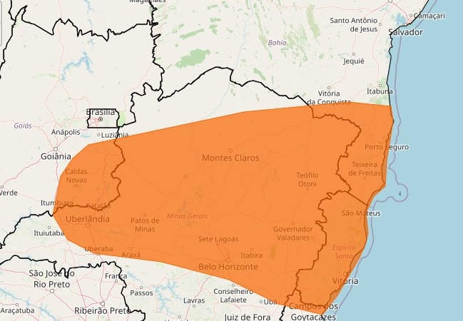Municípios que ficam no Sul e Centro Sul da Bahia, na região central de Minas Gerais, no Centro, Leste e Sul Goiano e no Noroeste e Norte Fluminense também estão inclusos no alerta de temporais.