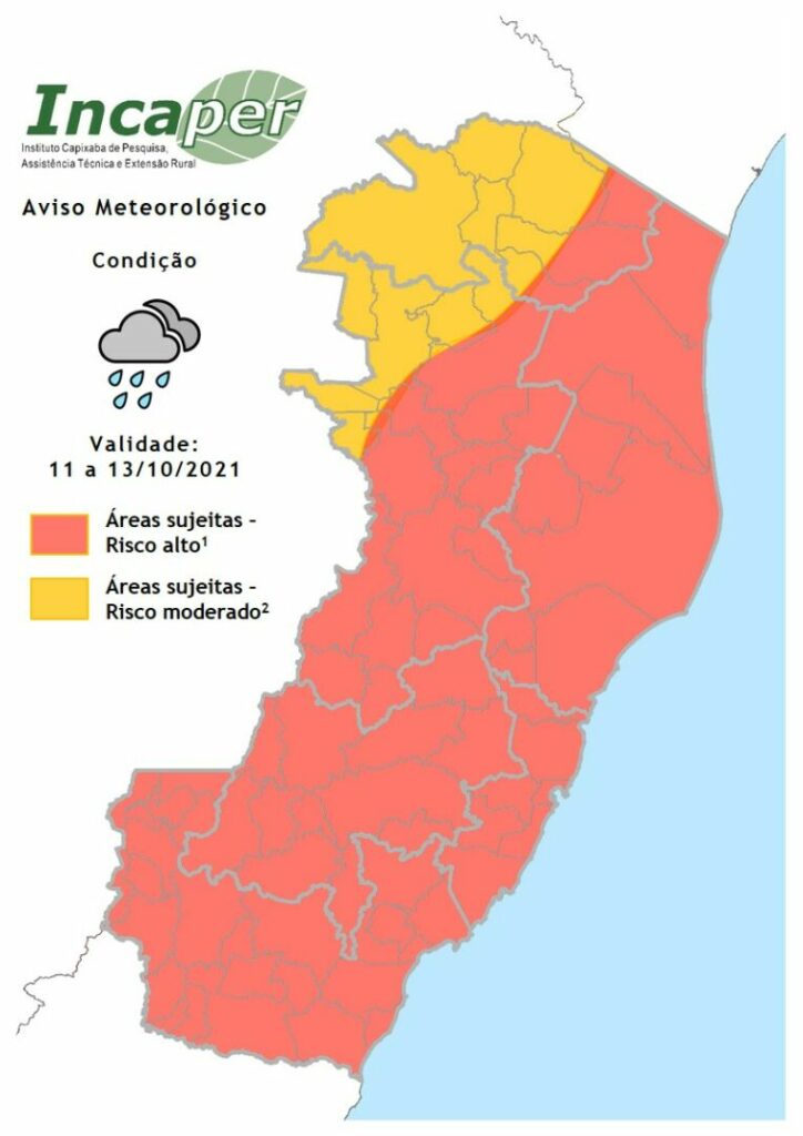 A Coordenadoria Estadual de Proteção e Defesa Civil, órgão coordenador do Sistema Estadual de Monitoramento e Alerta de Desastres do Governo do Espírito Santo, divulgou um alerta para diversos municípios do Espírito Santo devido à quantidade de chuva que tem caído no Estado desde ontem (10).