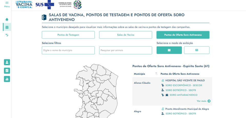 O portal Painel Vacina e Confia, do Governo do Estado, agora conta com um aplicativo para a divulgação de pontos de oferta de soros antivenenos. A ferramenta foi desenvolvida por residentes do Programa de Saúde Coletiva, com ênfase em Vigilância em Saúde, da Secretaria da Saúde (Sesa), realizado pelo Instituto Capixaba de Ensino, Pesquisa e Inovação em Saúde (ICEPi).