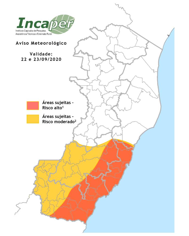 A chuva forte prevista pela Coordenação de Meteorologia do Instituto Capixaba de Pesquisa, Assistência Técnica e Extensão Rural (Incaper) chegou ao Espírito Santo. Um Aviso Meteorológico Especial foi disparado nesta terça-feira (22) informando nível de atenção. As chuvas virão acompanhadas de descargas atmosféricas e rajadas de vento, podendo ocasionar acumulados significativos de precipitação em alguns trechos do Estado, que apresentam risco alto ou moderado, conforme mostra a figura abaixo.