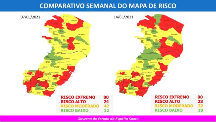 O Governo do Estado anunciou, nesta sexta-feira (14), o 55º Mapa de Risco Covid-19, que terá vigência desta segunda-feira (17) até o próximo domingo (23). Dos 78 municípios capixabas, 18 estão classificados em Risco Baixo, 32 em Risco Moderado e outros 28 em Risco Alto. Com o fim da regra da conurbação dos municípios da Grande Vitória, a classificação dos municípios passa a ser feita de forma individual.
