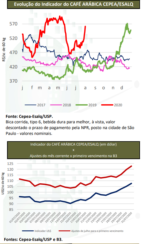 Após a forte queda no mês anterior, os preços do café arábica tiveram recuperação em julho. O Indicador CEPEA/ESALQ do tipo 6 bebida dura para melhor, posto na capital paulista, teve média de R$ 505,97/saca de 60 kg no mês, elevação de 4,7% em relação à de junho. Frente a julho/19, o aumento real foi de 10,7%, sendo que a média também é a maior para um início de safra desde jul/17 (valores deflacionados pelo IGP-DI de jun/20).