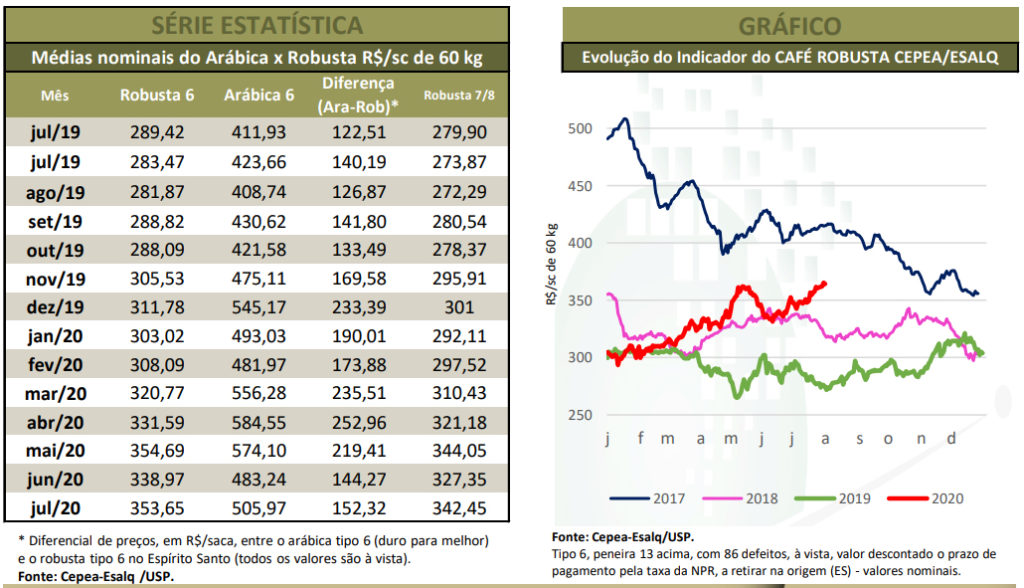 CAFÉ ROBUSTA – Os preços domésticos do café robusta também se recuperaram em julho. O Indicador CEPEA/ESALQ do tipo 6 peneira 13 acima foi de R$ 353,65/sc de 60 kg, alta de 4,3% frente a junho. O tipo 7/8 bica corrida teve média de R$ 342,45/sc, 4,6% superior no mesmo comparativo. Em relação a julho/19, as médias subiram 15,7% para o tipo 6 e 16% para o 7/8, em termos reais (os valores foram deflacionados pelo IGP-DI de jun/20).