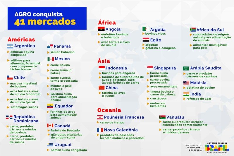De acordo com a Secretaria de Comércio e Relações Internacionais do Ministério da Agricultura e Pecuária, a abertura de novos mercados demonstra a competitividade e a confiabilidade do setor produtivo brasileiro reconhecido em mais de 200 países e territórios. O resultado é fruto do trabalho conjunto do Ministério da Agricultura e Pecuária (Mapa), com a atuação, principalmente, dos adidos agrícolas e do Ministério das Relações Exteriores (MRE) nas negociações comerciais bilaterais.