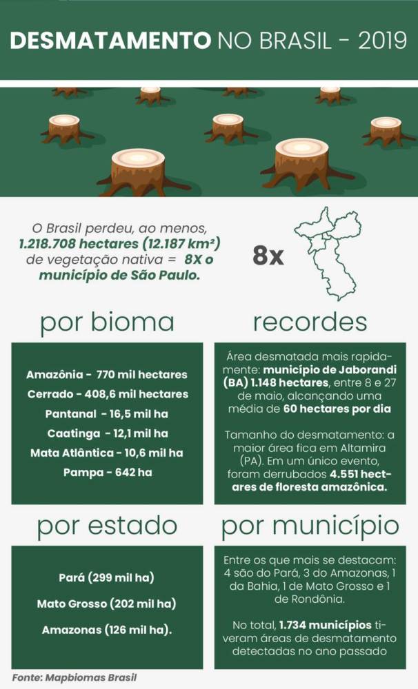 O Brasil perdeu cerca 10% de áreas de vegetação nativa, entre os anos de 1985 a 2019, de acordo com o Instituto de Pesquisa Ambiental da Amazônia (IPAM). Os mapas e dados apresentados pela organização não governamental mostram que o Brasil perdeu 87,2 milhões de hectares dessas regiões, com um ritmo de perda de vegetação nativa mais acelerado entre 2018 e 2019.