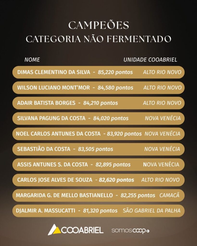 Já na categoria Café não Fermentado, o vencedor foi um estreante no concurso. A amostra de Dimas Clementino da Silva obteve 85,220 pontos, e conquistou o primeiro lugar. Ele é cafeicultor em Alto Rio Novo, mesmo município dos classificados com a 2ª e 3ª colocações na categoria, Wilson Luciano Mont’Mor e Adair Batista Borges, respectivamente.