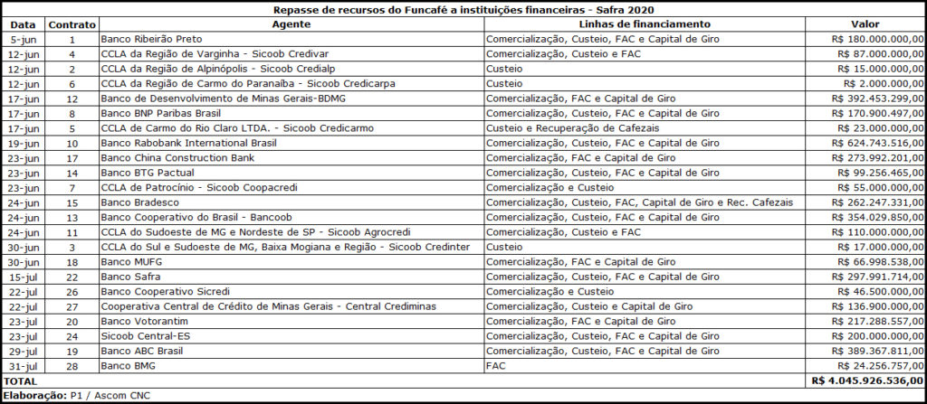 REPASSE A AGENTES – Os bancos ABC Brasil e BMG receberam, juntos, R$ 413,6 milhões do Funcafé, por meio de contratos assinados com o Ministério da Agricultura. Até o momento, o Fundo já encaminhou R$ 4,046 bilhões a 23 instituições financeiras.