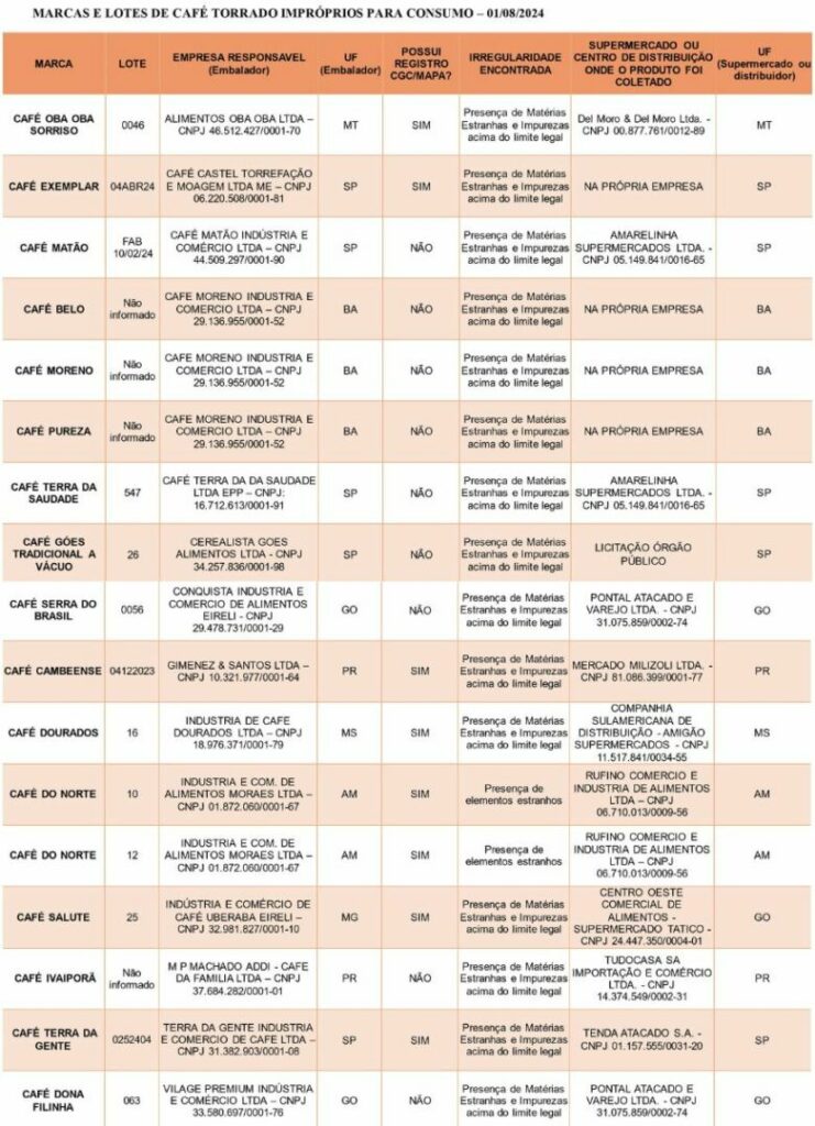 Dezesseis marcas de café torrado, de nove estados brasileiros, foram consideradas impróprias para o consumo pelo Ministério da Agricultura e Pecuária (Mapa), que divulgou a lista aos consumidores. Os cafés foram desclassificados após a detecção de matérias estranhas e impurezas ou elementos estranhos acima do limite permitido na Portaria nº 570/2022.