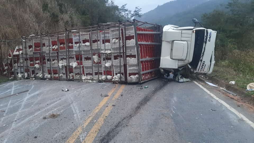 Um homem ficou ferido e frangos se espalharam em uma rodovia, após um caminhão tombar, na Rodovia Pedro Cola, na madrugada desta terça-feira (13), na localidade de Povoação, em Castelo, na Região Serrana do Estado.
