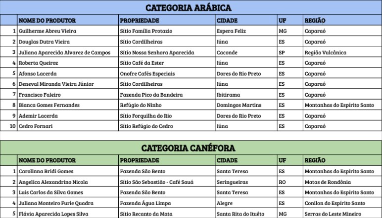 O grande campeão de arábica foi o café do Sítio Família Protazio, de Espera Feliz (MG), na região do Caparaó, produzido por Guilherme Abreu Vieira, conquistando 90,44 pontos. Já na categoria canéfora, o vencedor foi a Fazenda São Bento, de Santa Teresa (ES), na região das Montanhas do Espírito Santo, com o café produzido por Carollina Bridi Gomes, que pontuou 88,83.