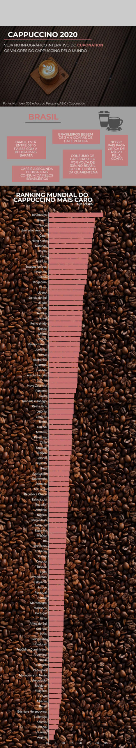 Um estudo recente feito pelo sistema Numbeo registrou o ranking das nações que possuem o cappuccino regular de restaurantes mais caro do mundo. Dentre mais de 100 países participantes, a pesquisa aponta que o Brasil está na 96ª posição da lista, pois por aqui os brasileiros pagam, em média, R$ 6,29 pela xícara – o que significa que o Brasil está entre os 10 países com o cappuccino mais barato do mundo.