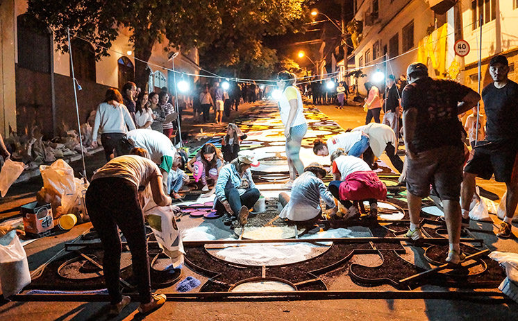 Areia, pedras, folhas, flores, palha de café, entre outros materiais serão utilizados para a confecção dos 17 quadros e 17 passadeiras ao longo de 1,5 km pelas ruas do Centro da cidade. Mais de três mil voluntários, da sede e do interior do Município, estão trabalhando durante meses nos preparativos para o evento.