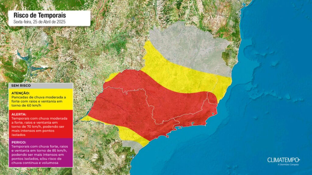 O último fim de semana de abril ainda será de chuva para boa parte da Região Sudeste. No sábado (26), as áreas de instabilidade começam a perder força, mas a chuva se espalha pelo Espírito Santo e volta a atingir o norte e leste de Minas Gerais. Em São Paulo e no Rio de Janeiro também pode chover no sábado, mas de forma moderada e sem risco de temporais. O sol até aparece em alguns momentos, mas sempre entre muitas nuvens.