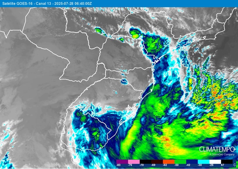No Sudeste, a frente fria começa a se afastar, mas a circulação dos ventos úmidos vindos do oceano mantém a instabilidade no litoral, principalmente entre o Rio de Janeiro, o leste de Minas Gerais e o Espírito Santo, com previsão de chuvas fracas a moderadas.