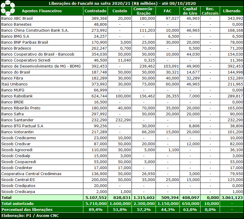 Apuração realizada pelo Conselho Nacional do Café (CNC) junto ao Ministério da Agricultura, Pecuária e Abastecimento (Mapa), constatou que a liberação dos recursos do Fundo de Defesa da Economia Cafeeira (Funcafé) às instituições financeiras, na safra 2020, chegou a R$ 3,1 bilhões.