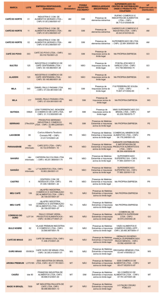 O alerta de risco faz parte dos desdobramentos da Operação Valoriza, que contou com ações de fiscalização em todo o país entre os dias 18 e 28 de março de 2024, tendo sido coletadas 168 amostras de café no período.