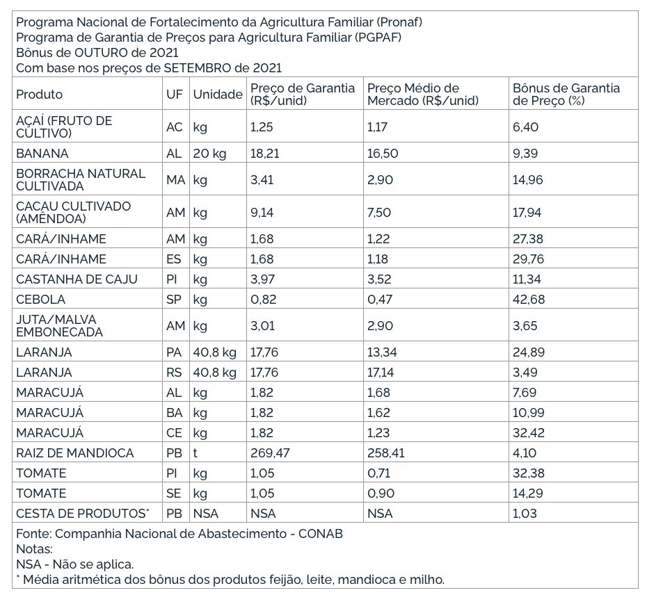 O Ministério da Agricultura, Pecuária e Abastecimento (Mapa) divulgou nesta sexta-feira (8) a relação dos produtos agrícolas com bônus de desconto em outubro para agentes financeiros operadores do Programa Nacional de Fortalecimento da Agricultura Familiar (Pronaf).