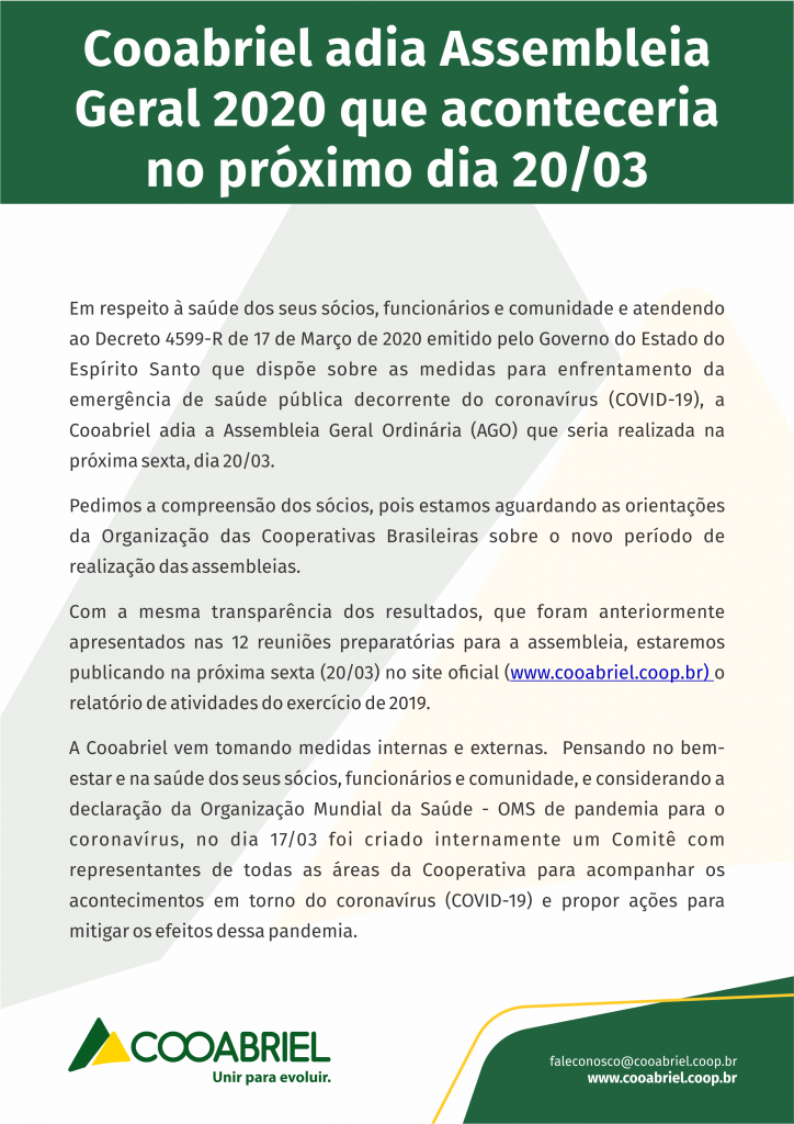 Até hoje cedo, o encontro estava mantido com restrições, mas, em comunicado, a Cooabriel informa que em respeito à saúde dos sócios, funcionários e comunidade e atendendo ao Decreto 4599-R, de 17 de março de 2020, emitido pelo Governo do Espírito Santo, que dispõe sobre as medidas de enfrentamento da emergência de saúde pública decorrente do novo coronavírus (Covid-19), a AGO está adiada.