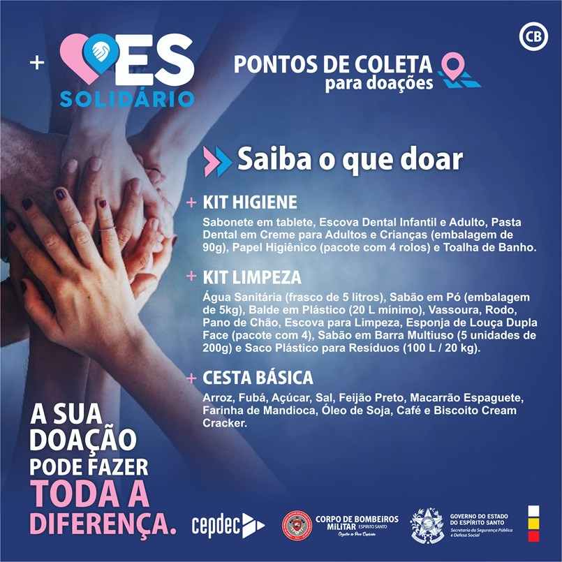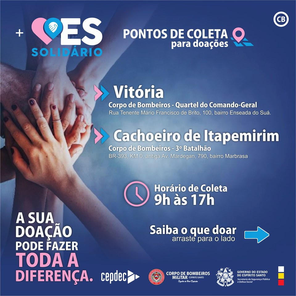 - Empresas que desejam doar em grande quantidade, pedimos que entre em contato diretamente com o Corpo de Bombeiros Militar do Espírito Santo (CBMES) através de nossos canais oficiais, para coordenar a entrega.