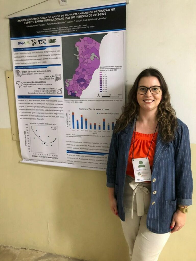 No mês de novembro, a médica-veterinária Gabriela Ponath Peruzzo, mestranda do PPGCV/Ufes, realizou a exposição do poster sobre “Análise epidemiológica de casos de raiva em animais de produção no Espírito Santo notificados ao Idaf no período de 2012-2022”, no Simpósio de Pesquisa e Extensão de Doenças Infecciosas do Programa de Pós-graduação em Doenças Infecciosas da Ufes. O trabalho ainda foi selecionado para apresentação oral e premiado com menção honrosa como destaque do evento.