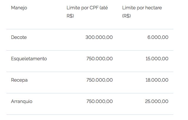 Os limites de crédito variam de acordo com o manejo a ser aplicado na lavoura. Decote, esqueletamento, recepa e arranquio são práticas culturais aplicadas no café, quando ocorre uma injuria na planta (climática, ataque de pragas, envelhecimento da planta, etc).