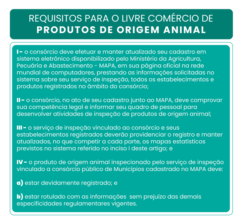Além disso, a Instrução Normativa estabelece que os produtos de origem animal poderão ser comercializados nos territórios dos municípios consorciados no mesmo estado daquele que mantém o registro do produto.
