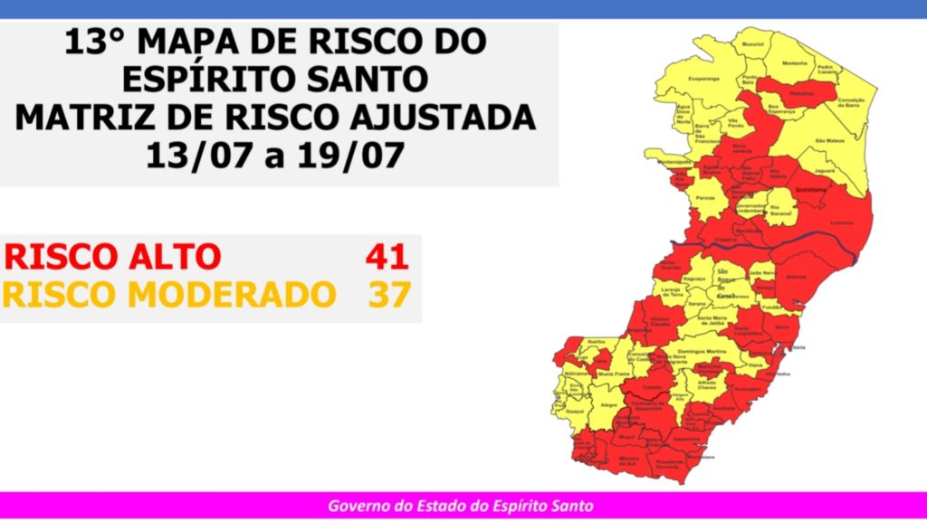 Nesta semana, 41 cidades seguem em risco alto e outras 37 em risco moderado. Não há nenhum município em risco baixo ou risco extremo. Entram em risco alto Afonso Cláudio, Apiacá, Atílio Vivacqua, Brejetuba, Jerônimo Monteiro, Mimoso do Sul, Pinheiros, Sooretama, Venda Nova do Imigrante e Vila Valério. Saem do risco alto para o moderado Boa Esperança, Divino de São Lourenço, Fundão, Guaçuí, João Neiva, Montanha, Mucurici, Ponto Belo, Santa Teresa e Viana.