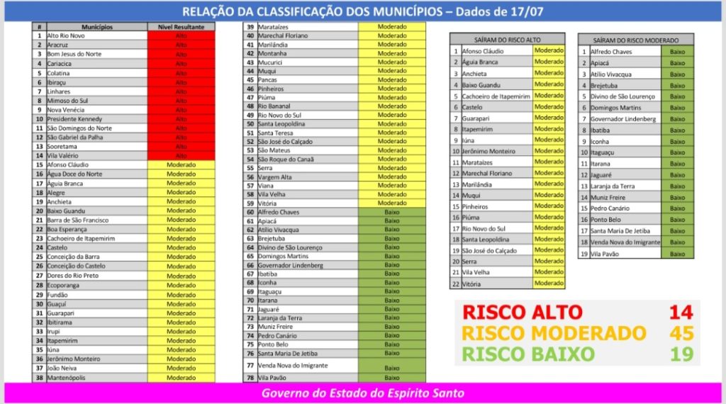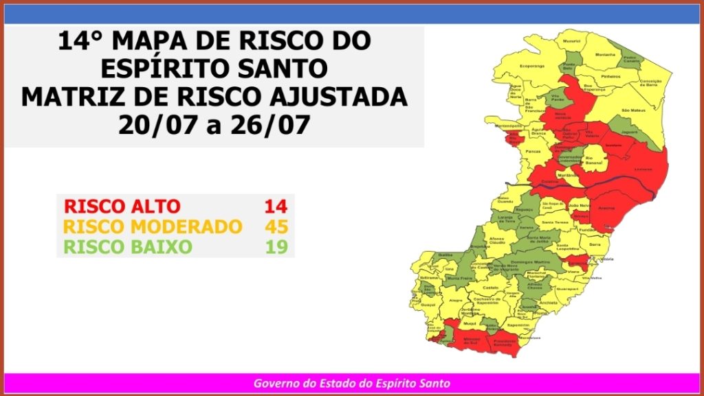 Dezenove municípios retornaram ao nível de risco baixo para transmissão do novo coronavírus no Espírito Santo. O anúncio foi feito, neste sábado (18), pelo governador Renato Casagrande, durante a apresentação do 14º Mapa de Risco Covid-19, que entra em vigor na próxima segunda-feira (20) e tem validade até o domingo (26). Com isso, 14 municípios permanecem em risco alto e outros 45 em risco moderado. O motivo da nova configuração é a queda da taxa de ocupação de leito para o nível de alerta, ou seja, abaixo de 80% – atualmente está em 76% .