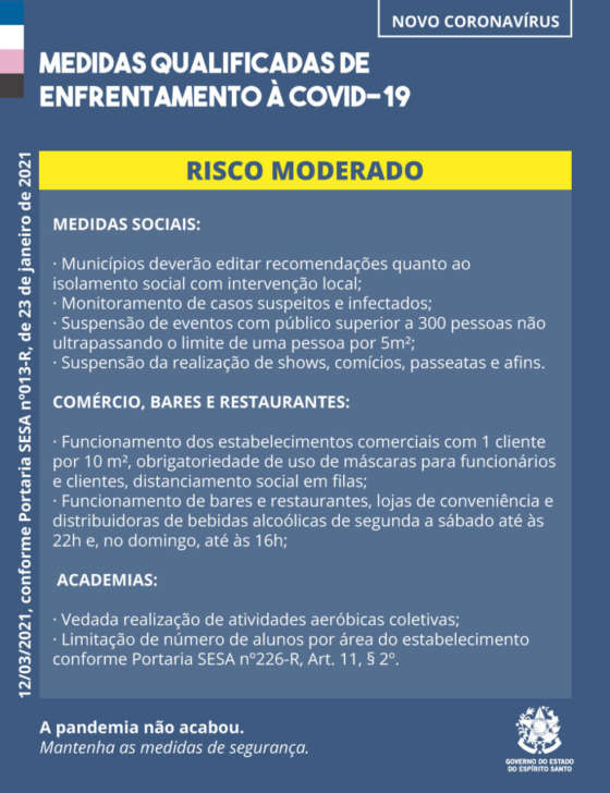 O Governo do Estado anunciou o 48º Mapa de Risco Covid-19, que terá vigência desta segunda-feira (15) até o próximo domingo (21). Dos 78 municípios capixabas, 61 estão classificados em Risco Moderado e 17 estão em Risco Alto. Não há municípios classificados em Risco Baixo.