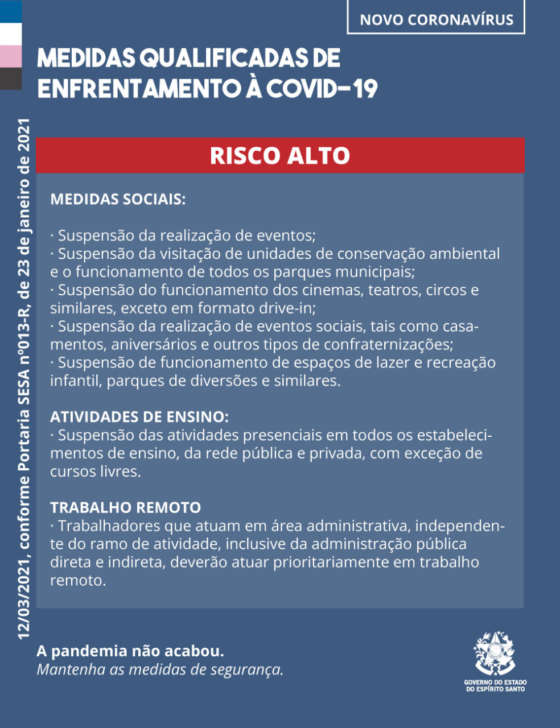 O Mapa de Risco segue as orientações dos boletins epidemiológicos do Ministério da Saúde e recomendações da equipe de especialistas do Centro de Comando e Controle (CCC) Covid-19 no Espírito Santo, que é composto pelo Corpo de Bombeiros Militar, Defesa Civil, Secretaria da Saúde (Sesa), Instituto Jones dos Santos Neves (IJSN) e da Universidade Federal do Espírito Santo (Ufes). As decisões adotadas pelo Governo do Estado seguem parâmetros técnicos.