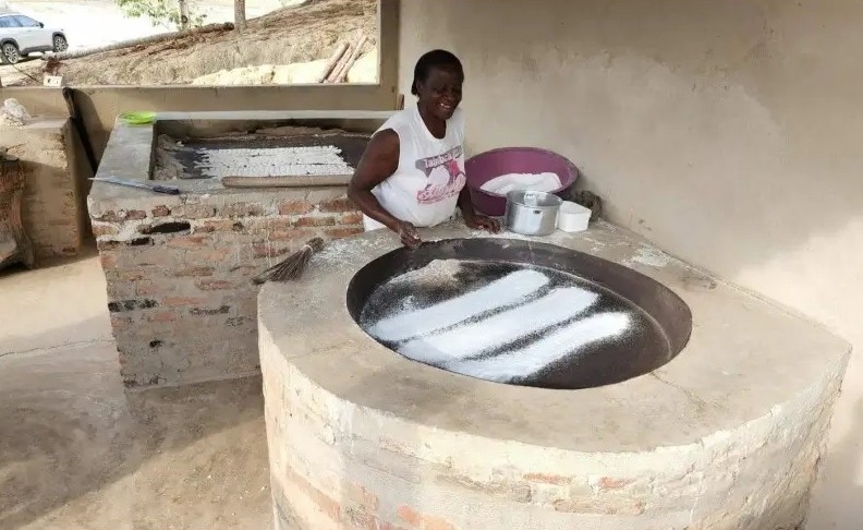 PRODUÇÃO – Todas as etapas do processo produtivo do beiju são realizadas pelas comunidades quilombolas – desde a preparação do terreno para o plantio da mandioca até a finalização do alimento, que pode ser enriquecido com outros produtos, como coco e amendoim. Após 12 meses de cultivo do tubérculo, o produto é direcionado à casa de farinha, ou quitungo (como o espaço é chamado) para ser descascado e ralado.