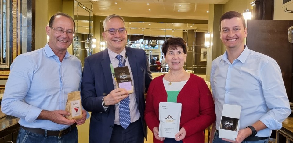 O secretário de Estado da Agricultura, Enio Bergoli e o subsecretário da Agricultura, Michel Tesch, presentearam a diretora Executiva da Organização Internacional do Café (OIC), Vanúsia Nogueira e o representante Permanente do Brasil nas Organizações Internacionais em Londres (Rebraslon), José Augusto Andrade, com cafés especiais produzidos nas três origens capixabas: Montanhas, Caparaó e Conilon