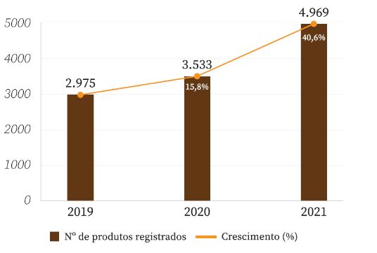 PRODUTOS – Em 2021, atingiu-se a marca de 4.969 registros de cachaças, sendo que desses, 810 continham mais de uma marca comercial no mesmo número de registro.