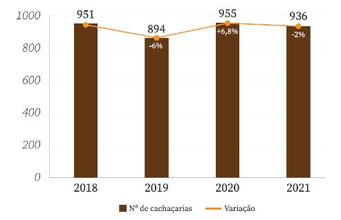 Apesar do aumento no número de municípios, o documento relata a diminuição de 2% na quantidade de estabelecimentos produtores de cachaça registrados no Mapa: em 2020, esse número foi de 955, enquanto 2021 fechou em 936 estabelecimentos. No período, foram registradas 98 novas cachaçarias e outras 117 cancelaram seus registros, o que corresponde a uma redução líquida de 19 cachaçarias em relação ao ano anterior.