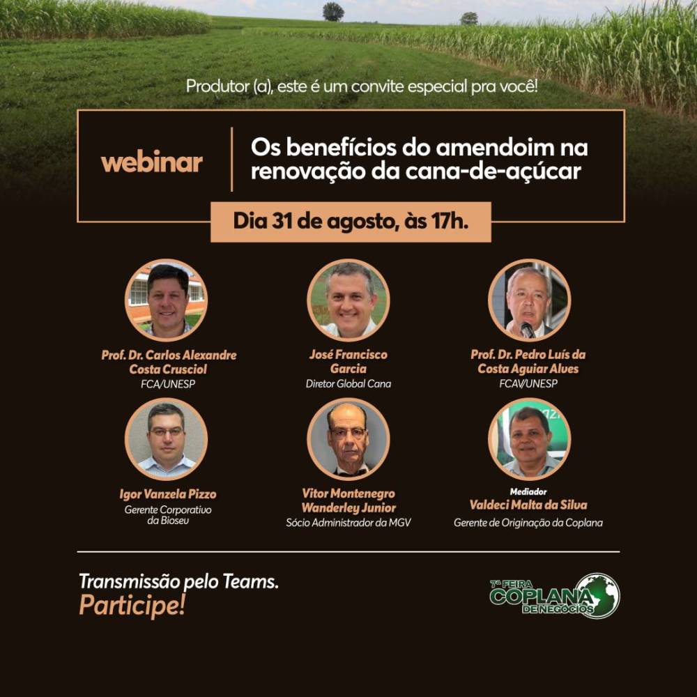 Para a videoconferência, a cooperativa convidou vários especialistas reconhecidos. Participam o Prof. Dr. Carlos Alexandre Costa Crusciol (Unesp de Botucatu) e o Prof. Dr. Pedro Luiz da Costa Aguiar Alves (Unesp Jaboticabal); José Francisco Garcia, diretor da Global Cana; Igor Vanzela Pizzo, gerente Corporativo da Biosev; Vitor Montenegro Wanderley Júnior, sócio administrador da MGV; com mediação do gerente de originação da Coplana, Valdeci Malta da Silva.