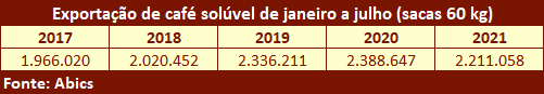 “Geralmente a comercialização de café solúvel é realizada com antecedências que variam de quatro a 18 meses, o que determina que as indústrias precisam, para não correr riscos, travar seus preços, em boa parte, com a aquisição física de matéria-prima. E é a partir da leitura mais lenta e desaquecida dessas comercializações que passamos a rever nossas projeções, inclusive para 2022, acendendo o sinal de alerta para o setor”, conclui.