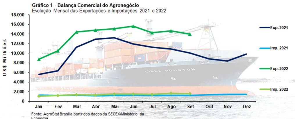 No período acumulado entre janeiro e setembro de 2022, as exportações brasileiras do agronegócio somaram US$ 122,07 bilhões, o que representou um incremento de 30,5% na comparação com o mesmo período em 2021