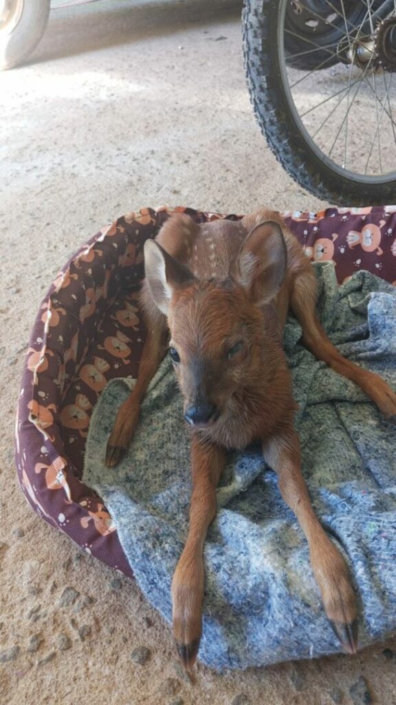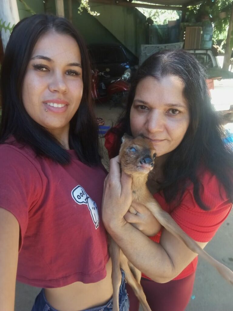 O filhote estava ferido, bastante debilitado e, segundo e equipe da Polícia Ambiental que resgatou o veadinho – que era uma fêmea – ela não estava movimentando as patas traseiras. “Meu marido a encontrou quase morta, trouxe para casa e eu comecei a cuidar dela, com a ajuda da minha vizinha Diana. Demos mamadeira e a alimentamos também com folhas enquanto tentávamos entrega-la para as autoridades para que ele pudesse ser cuidado da forma correta”, contou Ivone.