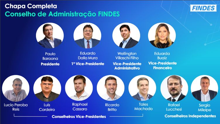 Farão parte do Conselho de Administração da Findes nos cargos de: 1º vice-presidente (Eduardo Dalla Mura), vice-presidente administrativo (Wellington Villaschi); vice-presidente financeiro (Eduarda Buaiz); conselheiros vice-presidentes (Lucio Peroba Reis, Luis Cordeiro, Raphael Cassaro, Ricardo Britto e Tales Machado); e conselheiros independentes (Rafael Lucchesi e Sérgio Mileipe).