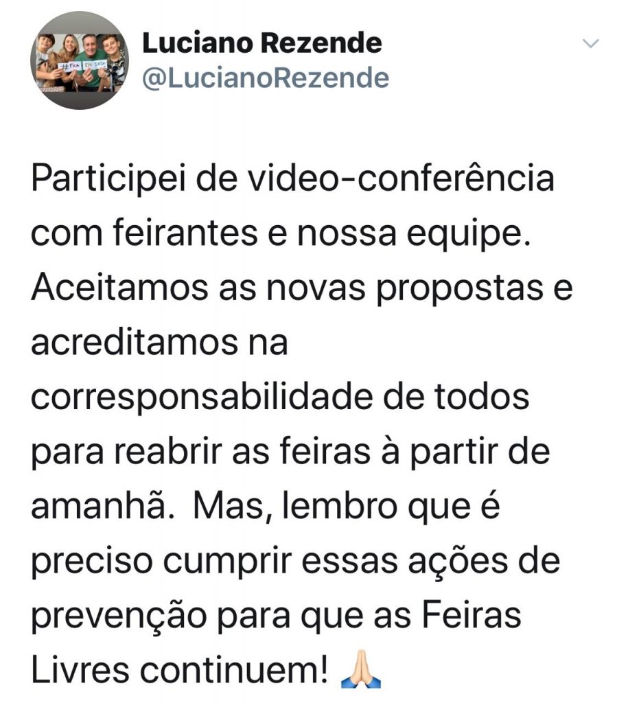 A informação foi publicada pelo próprio prefeito de Vitória, em seu perfil pessoal no Twitter. Na publicação, Luciano Rezende lembrou que, para reabertura das feiras livres, tanto feirantes quanto consumidores precisam cumprir as determinações dos órgãos sanitários.