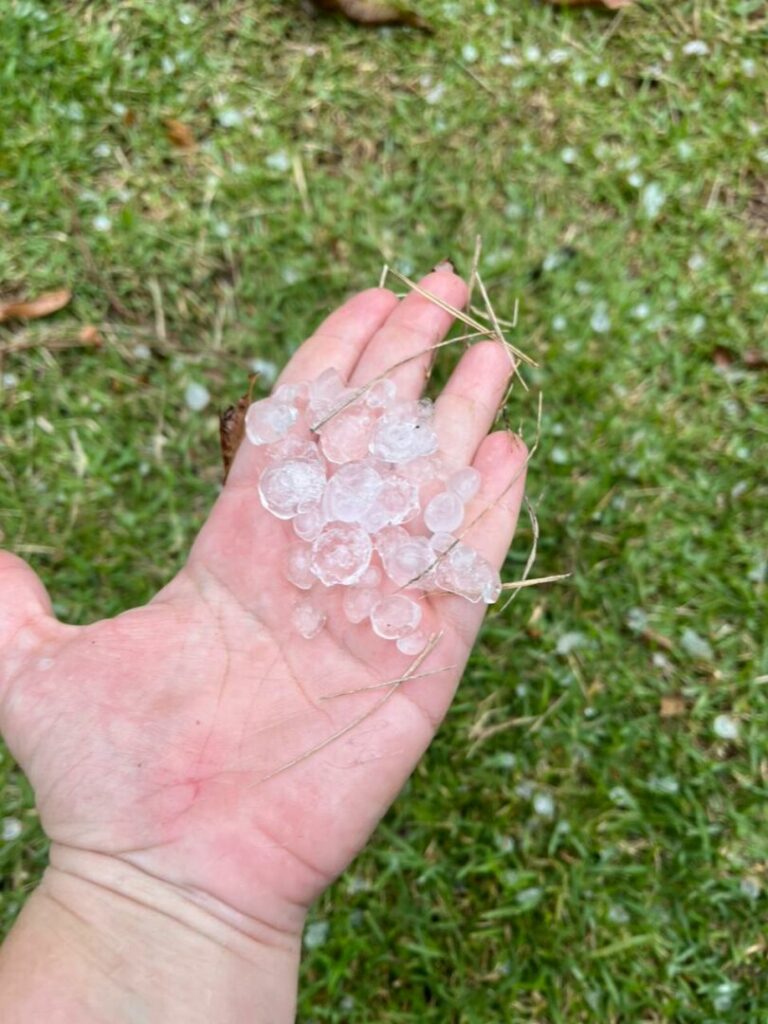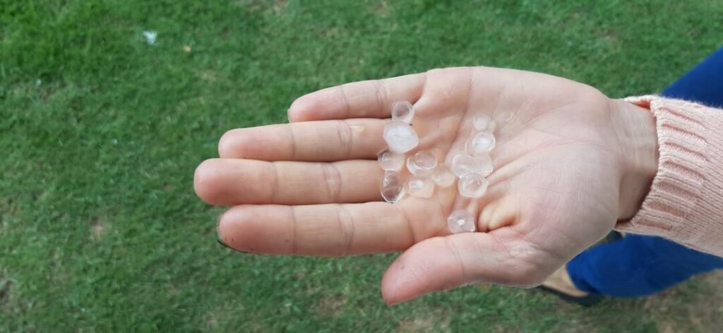 Dalva contou que hoje, até por volta de 15h, já havia chovido 26 milímetros, sendo que a maior parte desse volume foi após o almoço. Mesmo com o fim da queda do granizo, a chuva e trovoada continuava na localidade. “Há muito tempo que não via o tempo desse jeito. As nuvens surgiram e rapidamente começou a trovejar e chover. Ainda continua chovendo, mas a queda de granizo demorou alguns minutos”, relatou ela.