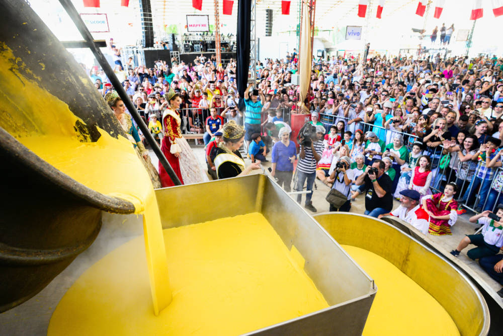 GASTRONOMIA – Reconhecida como um dos maiores eventos gastronômicos e culturais do Estado, a Festa é marcada pela fartura de polenta servida em diversas receitas e o emblemático Tombo da Polenta – momento em que um enorme caldeirão é virado para despejar mais de uma tonelada de polenta, ao som do hino “La bella polenta” e vista pelo público presente.