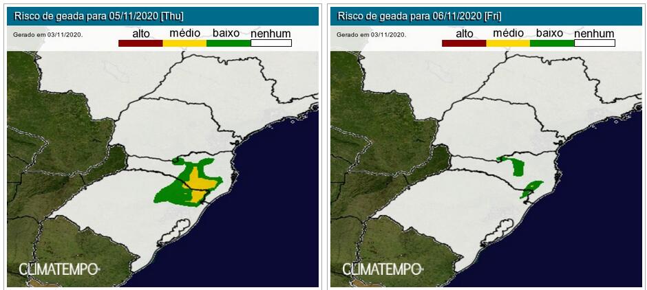 Durante a semana, os ventos frios da massa polar ainda atuam sobre o Sul. A ausência de nuvens vai favorecer com que a temperatura caia de forma rápida e acentuada ao longo da noite e na madrugada. Por isso, entre quinta e sexta-feira, dias 5 e 6 de novembro, há risco de geada fraca nas áreas de serra do Rio Grande do Sul e de Santa Catarina. Veja a indicação no mapa abaixo.