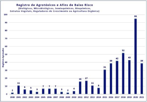PRODUTOS DE CONTROLE BIOLÓGICO – Com o registro desses 12 produtos, já somam 39 os produtos de baixo impacto para o controle de pragas (biopesticidas) registrados no ano de 2021. Em 2020, foram 95 produtos desse tipo registrados, ano recorde.