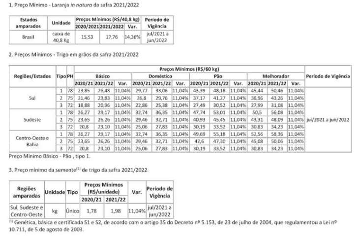 A partir de julho deste ano, os preços mínimos para laranja in natura, o trigo em grão e semente de trigo sofrerão reajustes. O novo valor da caixa de 40,8 kg da laranja in natura na safra 2021/2022 é de R$ 17,76, alta de 14,36%.