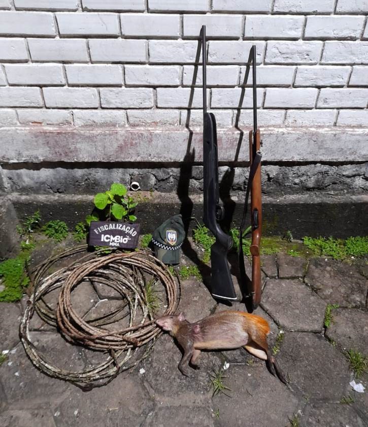 Os agentes realizaram um cerco no local e, após algum tempo, observaram a saída de dois homens do interior do fragmento de Mata Atlântica, momento em que foi procedida a abordagem, sendo encontradas com eles duas espingardas calibre 22, 47 munições de mesmo calibre, uma cutia abatida, que continha perfurações pelo corpo, dois capacetes, lanternas e outros petrechos de caça.